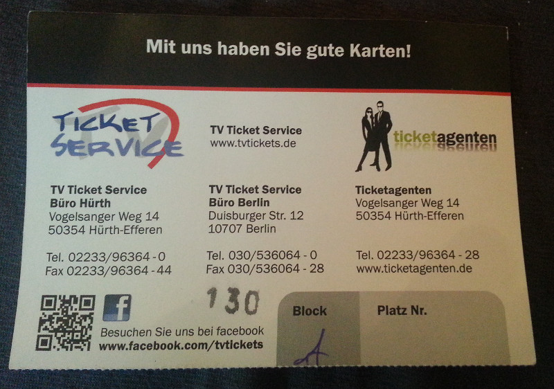 Am Freitag war es dann so weit: Die Aufzeichnung der Sendung stand an. Von 16:00 - 16:30 Uhr sollte die Ausgabe der Zuschauertickets in den Kölner Fernsehstudios erfolgen, in denen auch zahlreiche andere Produktionen gedreht werden - z.B. "TV total" oder "Schlag den Raab". Als wir dann um kurz nach vier angekommen waren, sind wir auch direkt zur Ticketausgabe gegangen. Mein Vater musste noch eine Einverständniserklärung ausfüllen, welche die Abtretung der Bildrechte betrifft, da ich ja noch nicht 18 Jahre alt bin. Darauf erhielten wir die zwei Tickets, auf welchen wir nochmals unsere Daten (Name, Anschrift, E-Mail-Adresse, Handynummer und Unterschrift) eintragen mussten und damit unsere Bildrechte ans ZDF übertrugen. Dieser Abschnitt wurde dann einfach beim Einlass abgetrennt.